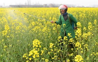 3月27日,龙湾镇腰河村农民罗万生在田间给油菜喷施多菌灵杀菌剂。眼下,正值油菜盛花期,该镇组织农管人员深入田间地头指导农民清沟降渍、防控病虫、科学施肥,以确保夏油丰收。据悉,该镇今年种植油菜3万亩,预计每亩单产可达200公斤。(记者田永祥 通讯员金必祥摄)