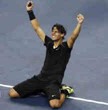 今日,2010年美国网球公开赛进入到男单冠军争夺战。继昨天因雨延期之后,今天的比赛再度因雨中断了近2小时,不过这丝毫没有影响头号种子纳达尔的发挥,最终西班牙人经过四盘激战以6-4/5-7/6-4/6-2力擒3号种子德约科维奇,首次问鼎美网,纳达尔也继阿加西后成为男子网坛“金满贯”第二人。此外,美网也是纳达尔今年继法网、温网之后连续获得第3个大满贯冠军,这也是他职业生涯第9个大满贯冠军和第42个单打冠军。