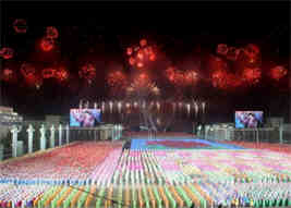 10日晚,朝鲜首都平壤,朝鲜劳动党建党65周年庆祝活动在这里举行。19时30分左右,盛大的联欢晚会在金日成广场开始。朝鲜最高领导人金正日在繁花似锦的焰火中出现在晚会现场,同时出席的还有朝鲜劳动党军事委员会副委员长金正恩。正在朝鲜进行正式友好访问的中共中央政治局常委、中央政法委书记周永康同10万平壤各界人士一起观看。