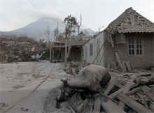 图:在印度尼西亚默拉皮火山附近,一头死去的母牛尸体上落满火山灰。