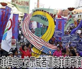 【封面新闻】8日,菲律宾马尼拉,女性示威者手拿举牌和涂成黄色的丝带,丝带另一半是美国国旗的行星和条纹。她们纪念国际妇女节,谴责美军驻扎和即将到来的菲美军事联合演习。