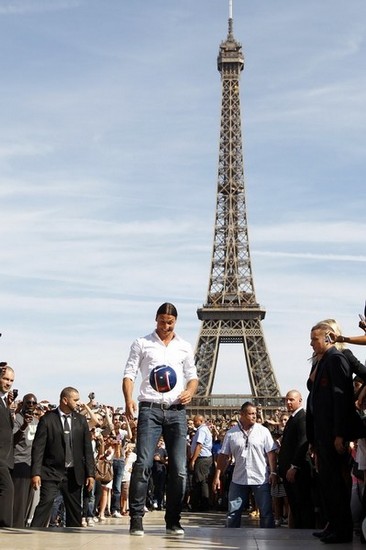 当地时间7月18日,法国巴黎,瑞典球员伊布拉希莫维奇正式亮相巴黎圣日耳曼,并在埃菲尔铁塔前展示球衣。