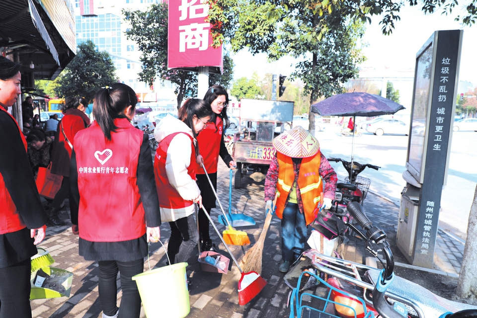 近日,农行随州分行团委组织青年团员和青年志愿者走上街头,清扫路面垃圾,清洁公交站台,协助环卫工人打扫人行道卫生,充分践行青年人的责任与担当。(随州日报通讯员王运涛摄)