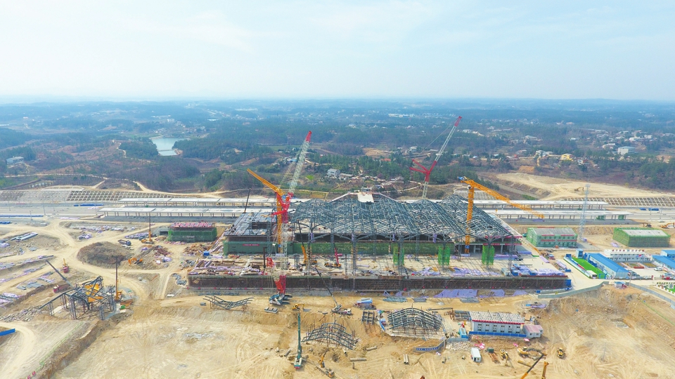 汉十高铁随州南站及站前广场建设快速推进,预计今年11月可全面建成。图为3月14日正在建设中的随州南站工地。(随州日报全媒体记者徐斌摄)
