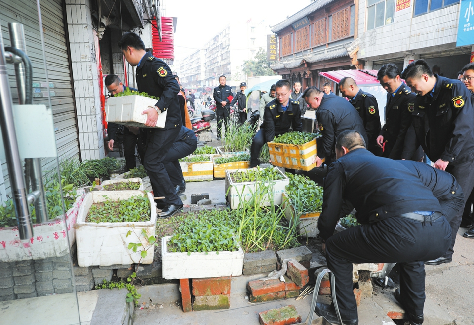 连日来,曾都区用铁的手腕以雷霆之势抓好环境秩序集中整治,着力治脏、治乱、治违、治堵,推动城乡面貌、形象全面改观。图为城管执法人员在随城聚玉街清理占道经营。(随州日报全媒体记者唐天才特约记者张立摄)
