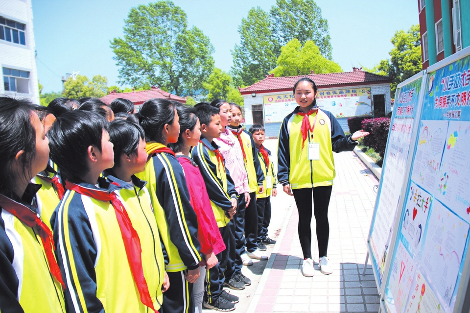 曾都区洛阳镇高级小学开展以“小手牵大手”为主题的系列活动,从思想重视、环境造势、活动践行等环节扎实推进创建全国文明城市。图为该校“文明宣传员”对“小手拉大手”活动精神进行宣讲。(随州日报通讯员毛利摄)