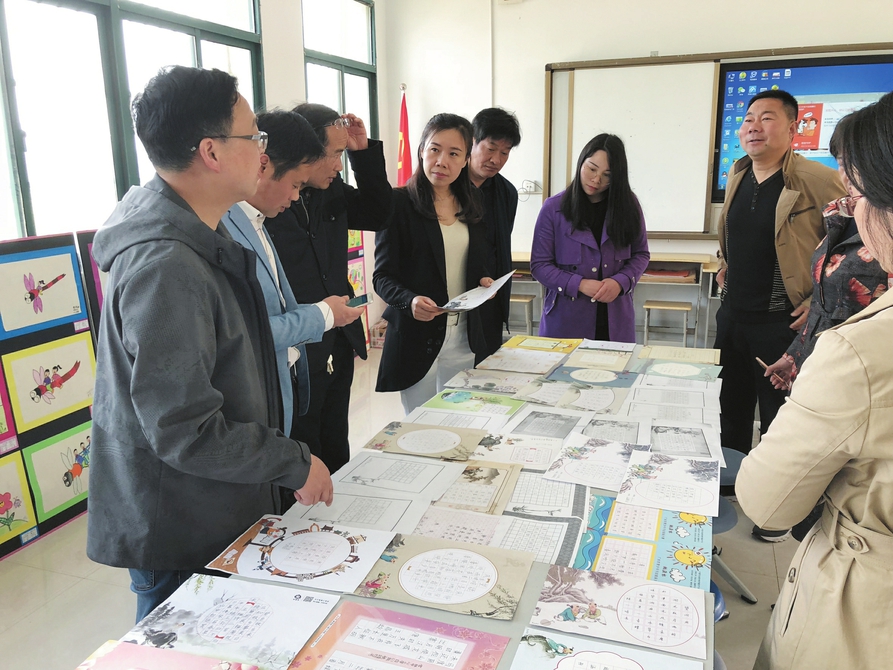 书法生辉,翰墨飘香。近年来,广水市扎实开展校园书法教学,注重从教学管理实、文化建设浓、书法研究深、成果积淀厚等方面,开展书法传统教育,营造浓厚书法氛围。图为该市小学书法比赛复赛作品选拔现场。(随州日报特约记者朱青、通讯员卢辉摄)