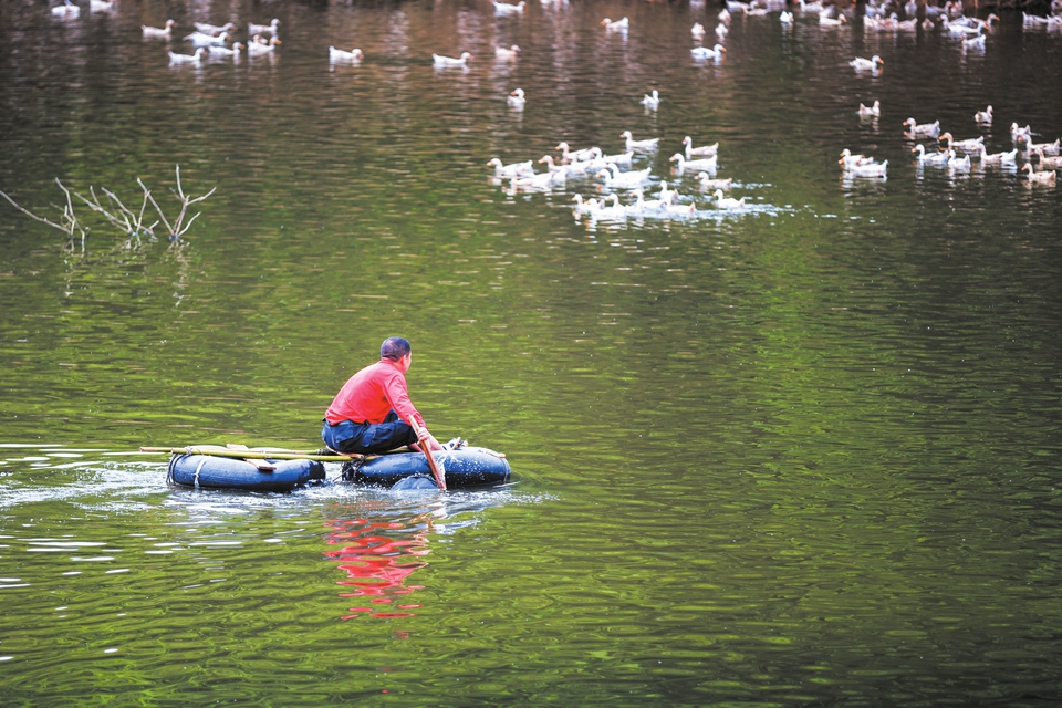 随县高城镇七里塔村民陈小国放弃在外务工的优厚待遇,回到村里和村民合伙承包堰塘、水库,养殖生态鸭8000多只,并成立“七里塔村旺鑫养殖合作社”,带动周边7户村民一起养鸭致富。(随州日报全媒体记者孙洪涛、通讯员张玉国摄)