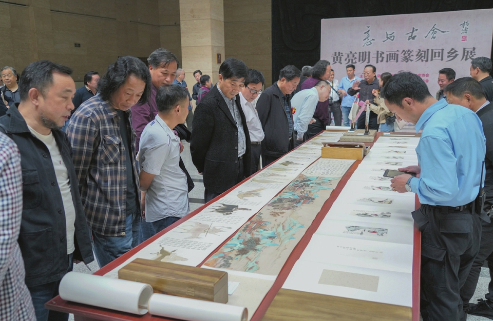 黄亮明书画篆刻回乡展日前在随州博物馆开展。展览展出了黄亮明近年来精心创作的60多幅书画篆刻作品,开展仪式上,来自北京的书画名家对展览给予了高度评价。黄亮明于2002年赴北京学习,多年来坚持不懈,终于学有所成,形成了自己清新典雅的艺术风格。(随州日报全媒记者孙洪涛摄)