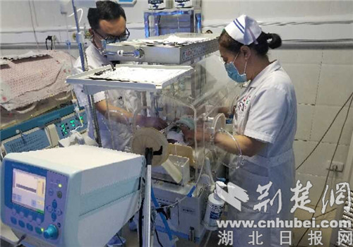 荆楚网客户端—荆楚网消息(通讯员 夏尧、江广春)4月26日凌晨,随州市妇幼保健院产科三区医生给刚刚从万和镇卫生院转诊过来的产妇李女士进行急诊破宫产术。可是,胎龄31周+5天早产的双胞胎姐姐出生体重只有860g,妹妹虽说有1515g,但生下来不哭,颜色青紫,肌张力低下,心跳微弱。按惯例进入手术室待命的新生儿科医生和手术室医生立即对两姐妹进行抢救,随之出现的一系列并发症,小姐妹又马上转入新生儿科进行治疗。