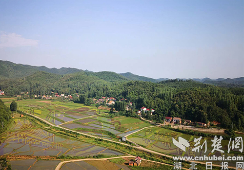 7月10日,在大洪山风景区游客服务中心附近的珍珠泉村空山谷,笔者看到,近300亩的稻田里,各种色彩的秧苗长势良好。远远望去,各种艺术图案若隐若现。