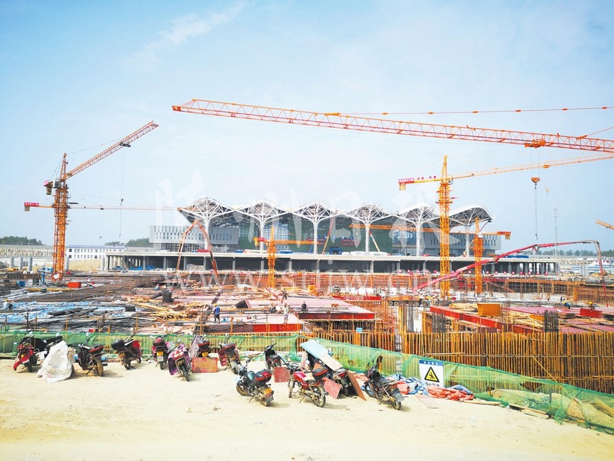 随州高铁站是汉十高铁线的重要节点站,为确保汉十高铁按计划通车,工程建设者战高温全力冲刺。图为8月10日随州高铁站建设工地现场。(随州日报全媒记者罗毅摄)