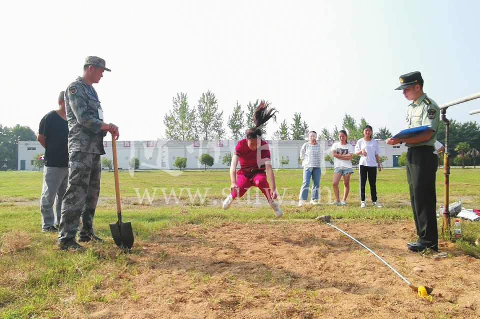 8月9日,随州市开展2019年女兵应征初检,按照政治思想、身体条件、文化素质等初选的47名女青年参加了体能测试。图为三项体能测试之一的立定跳远测试现场。据悉,今年随州市报名应征女兵的适龄女青年有200余名,其中47名初选对象全部为大学毕业或在校大学生及大学新生。(随州日报全媒记者李文军、通讯员闵聪摄)