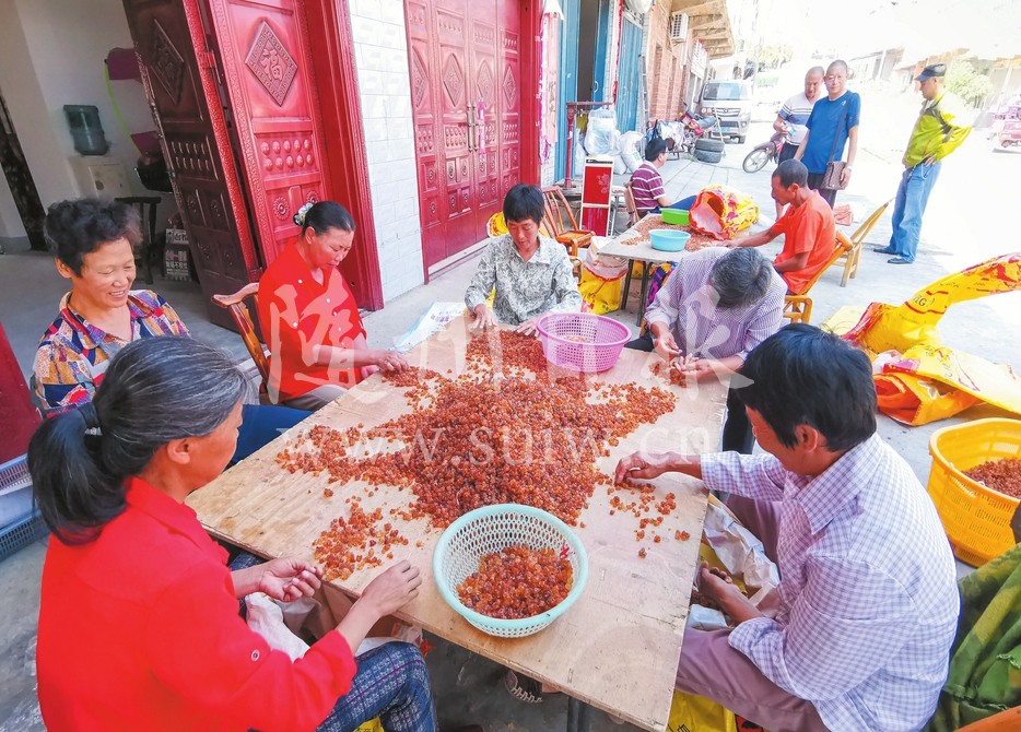 随县唐县镇利用当地油桃资源,积极引导合理发展桃胶产业,产品远销两广、江浙、东北等地。图为村民正在分拣桃胶。(随州日报全媒记者李文军摄)