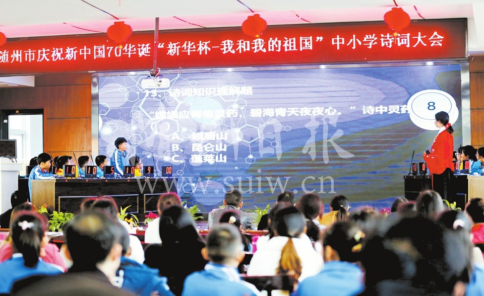 11月26日,随州市庆祝新中国成立70周年“我和我的祖国”中小学生诗词大会举行,比赛设小学组、初中组、高中组三个专场,以中小学教材涉及的古诗词为主。(随州日报全媒记者徐斌摄)