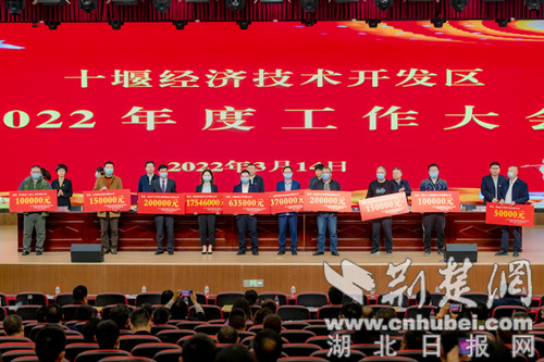 荆楚网(湖北日报网)讯(通讯员 刘爱理)3月14日上午,十堰经济技术开发区召开2022年工作大会,对易捷特新能源汽车有限公司、十堰松林工贸有限公司、十堰东风采埃孚减振器有限公司、湖北十堰先锋模具股份有限公司等153家产值突破企业、隐形冠军企业、内外贸突出贡献企业等进行奖励,奖励总金额达到2477.4万元。