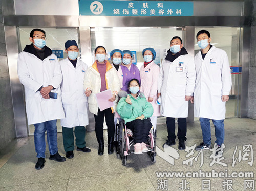 1月12日上午,妍妍的溃疡创面愈合,顺利出院。在科室住院病区门口,妍妍和广水一医院皮肤烧伤整形美容外科医护团队留下了充满祝福和欢笑的合影。