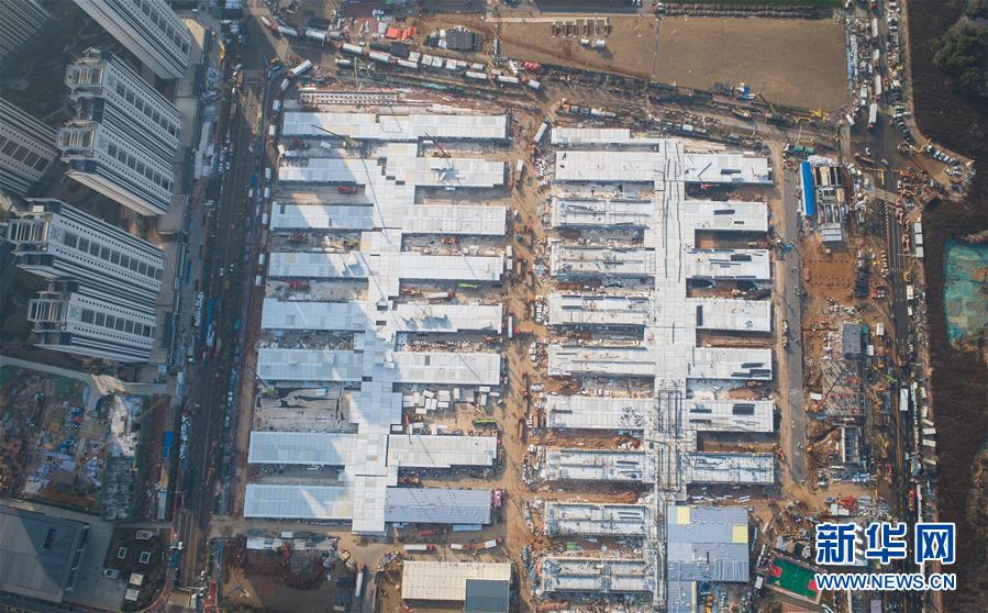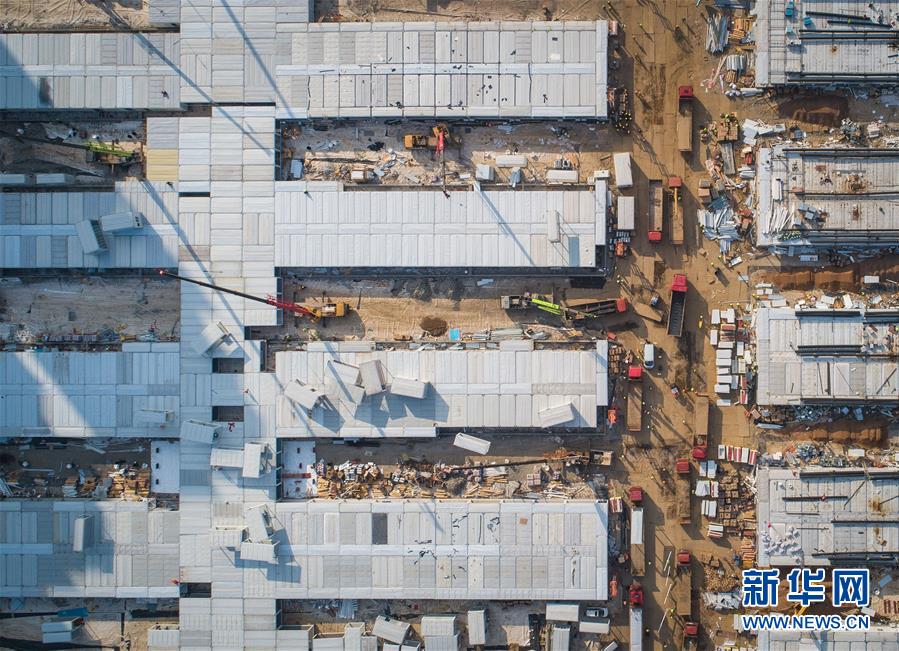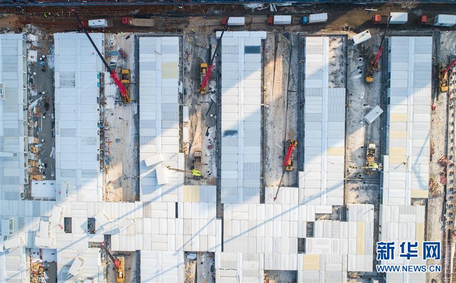 2月4日,在武汉雷神山医院建设工地,来自中建三局的建设工人在加紧施工(无人机照片)。新华社记者 肖艺九 摄