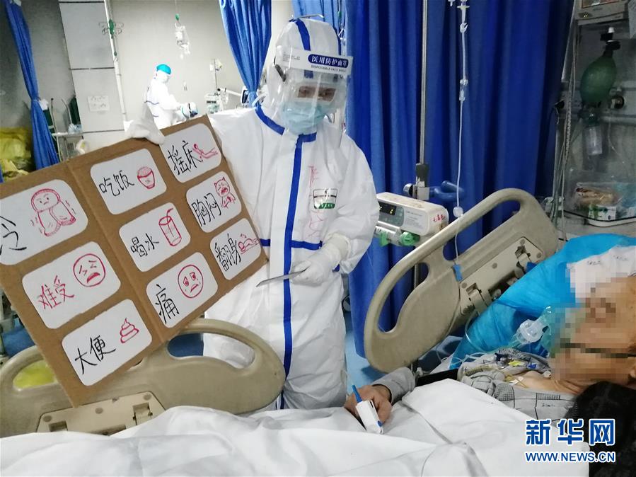 在武汉市第五医院重症病区,来自江西省人民医院第一批援助武汉的护士陈钰浠给患者看她的“图解护理需求表”,以方便双方的交流(2月24日摄)。 近日,在武汉市第五医院重症病区,来自江西省人民医院第一批援助武汉的护士陈钰浠自制了一张“图解护理需求表”,解决了重症患者不方便言语和医护人员听不懂方言的困难,方便了全队的护患沟通工作。 新华社发(江西省人民医院供图)