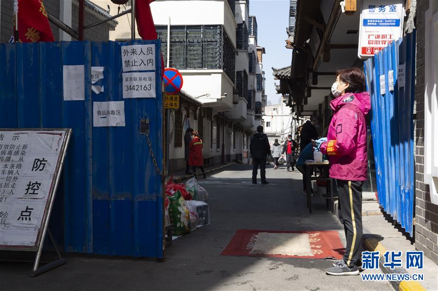3月15日,刘晓琳(前右)在水星台社区入口值守。 新华社发(谢剑飞 摄)