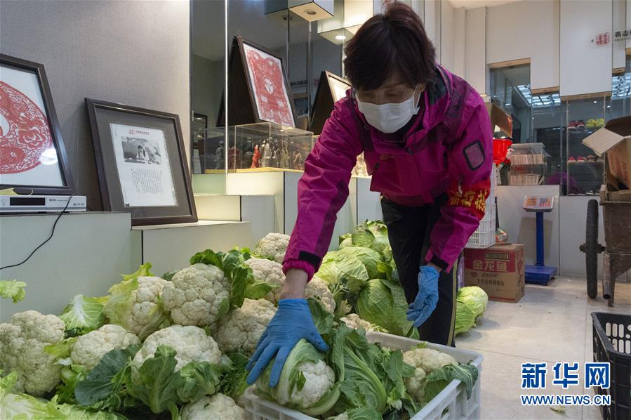 3月15日,在水星台社区党群服务中心,刘晓琳整理新一批到社区的蔬菜。新华社发(谢剑飞 摄)