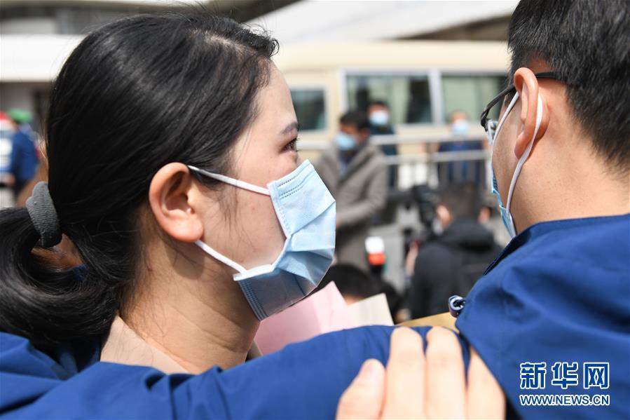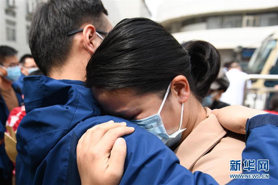4月14日,在安徽医科大学第一附属医院,援鄂医疗队员刘钢(左)与妻子吴乐相拥。 当日,安徽医科大学第一附属医院的5名援鄂医疗队员休整期满,解除集中隔离,与前来迎接的家人团聚。1月27日,这5名医护人员随安徽省首批支援湖北医疗队奔赴武汉,3月31日从武汉返回合肥。 新华社记者 张端 摄