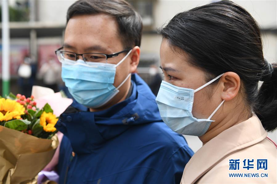 4月14日,在安徽医科大学第一附属医院,妻子吴乐(左)看着援鄂医疗队员刘钢。 当日,安徽医科大学第一附属医院的5名援鄂医疗队员休整期满,解除集中隔离,与前来迎接的家人团聚。1月27日,这5名医护人员随安徽省首批支援湖北医疗队奔赴武汉,3月31日从武汉返回合肥。 新华社记者 张端 摄