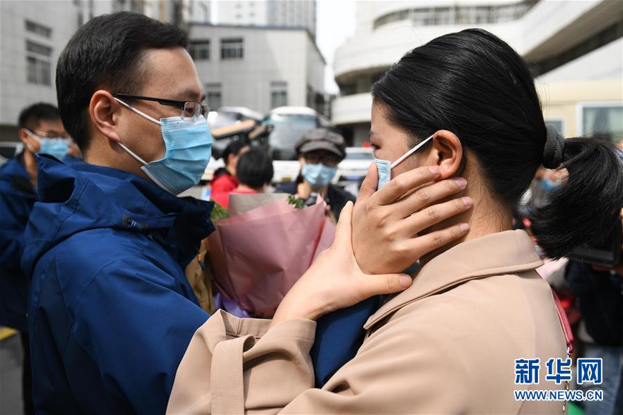 4月14日,在安徽医科大学第一附属医院,援鄂医疗队员刘钢(左)与妻子吴乐团聚。 当日,安徽医科大学第一附属医院的5名援鄂医疗队员休整期满,解除集中隔离,与前来迎接的家人团聚。1月27日,这5名医护人员随安徽省首批支援湖北医疗队奔赴武汉,3月31日从武汉返回合肥。 新华社记者 张端 摄