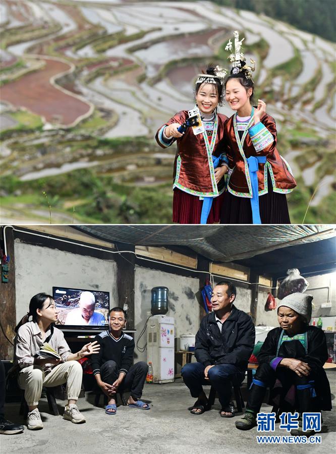 拼版照片上图:吴贤艳(左)与村里的大一女生梁琼英在直播推介加榜梯田风光(4月19日摄);下图:吴贤艳(左一)夜访贫困户(4月18日摄)。 从江县是贵州省深度贫困县之一。1994年出生的从江县侗族女孩吴贤艳在2017年大学毕业后回到月亮山区。2019年3月,她成为从江县加榜乡加车村脱贫攻坚指挥所的一名网格员。吴贤艳和其他驻村干部不仅会主动帮助缺少劳动力的农户,还利用闲暇时间通过网络平台,向山外推介美丽的加榜梯田和苗寨风光,吸引更多的游客来旅游,为村民们脱贫增收出谋划策。 党的十八大以来,我们坚持以人民为中心的发展思想,明确了到2020年我国现行标准下农村贫困人口实现脱贫、贫困县全部摘帽、解决区域性整体贫困的目标任务。目前看,脱贫进度符合预期,成就举世瞩目。这些成绩的取得,凝聚了全党全国各族人民智慧和心血,是广大干部群众扎扎实实干出来的。 脱贫摘帽不是终点,而是新生活、新奋斗的起点。 新华社记者 杨文斌 摄