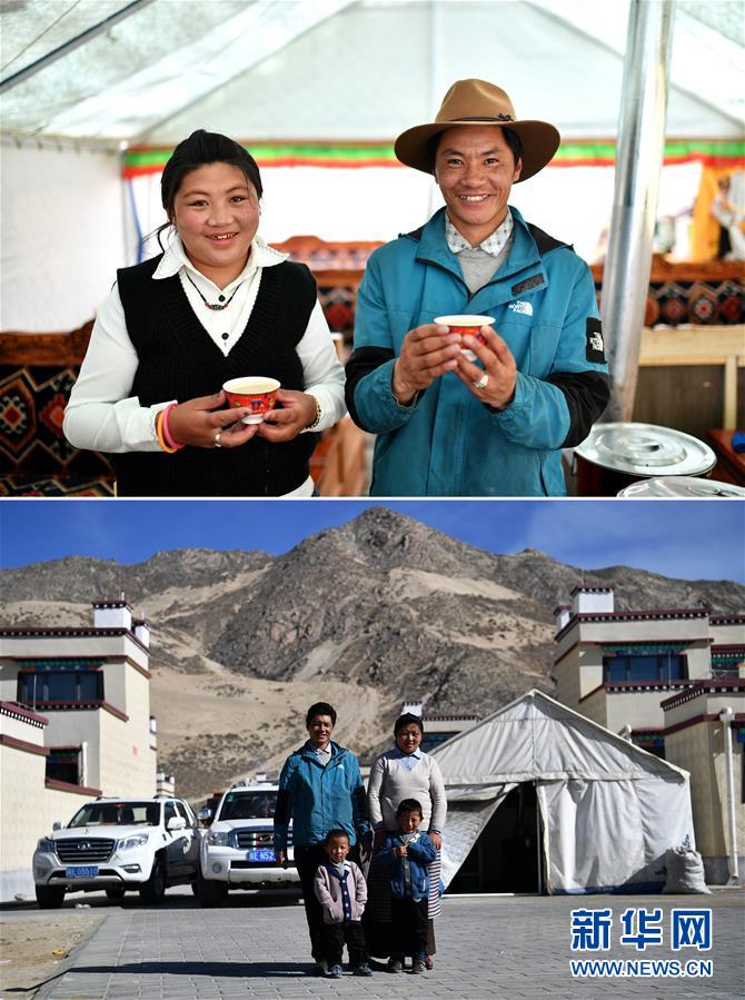 拼版照片上图:在森布日极高海拔地区生态搬迁安置点,格多(右)和妻子洛巴在展示自家打的酥油茶;下图:在森布日极高海拔地区生态搬迁安置点,格多(后左)和妻子洛巴及大儿子扎西尼玛(前右)、小儿子普巴多杰在帐篷茶馆前合影(照片均摄于4月15日)。 格多的老家在西藏那曲市安多县色务乡,一个藏北偏远的牧区。2019年底,政府对平均海拔4500米以上的那曲市安多县、双湖县进行极高海拔地区生态搬迁。和格多一家一样,安多县、双湖县搬迁下来的4000余名群众完成了人生的迁徙,开启了更加美好的生活。 党的十八大以来,我们坚持以人民为中心的发展思想,明确了到2020年我国现行标准下农村贫困人口实现脱贫、贫困县全部摘帽、解决区域性整体贫困的目标任务。目前看,脱贫进度符合预期,成就举世瞩目。这些成绩的取得,凝聚了全党全国各族人民智慧和心血,是广大干部群众扎扎实实干出来的。 脱贫摘帽不是终点,而是新生活、新奋斗的起点。 新华社记者 詹彦 摄