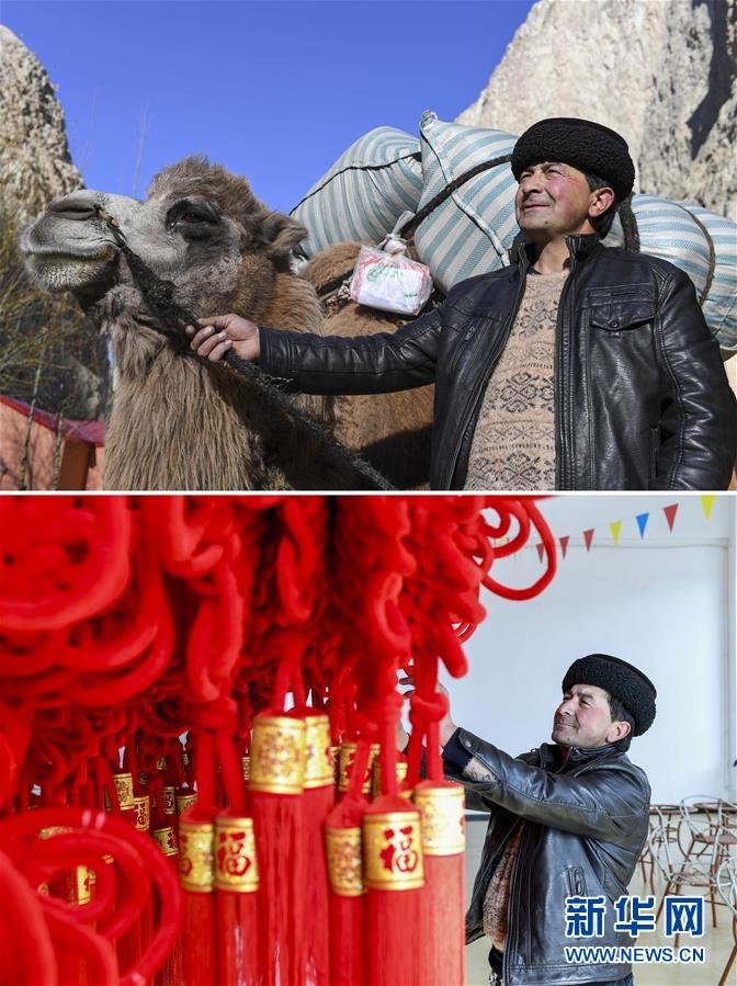 拼版照片上图:都热·加尔曼牵着驮有搬迁行李的骆驼走在喀喇昆仑山中(2018年11月17日摄);在塔什库尔干塔吉克自治县塔提库力易地扶贫搬迁安置点的卫星工厂,都热·加尔曼在参观由村民编制的手工艺品,他计划让妻子来这里上班(2018年11月18日摄)。 2018年以来,新疆塔什库尔干塔吉克自治县对居住在艰苦偏远山区、生产生活资料匮乏、难以实现就地脱贫的358户贫困户,陆续实施易地扶贫搬迁,搬迁至距县城约25公里的塔提库力易地扶贫搬迁安置点。安置点还开发了耕地、草场,建有卫星工厂,确保像都热一样的贫困户能稳步增收脱贫。 党的十八大以来,我们坚持以人民为中心的发展思想,明确了到2020年我国现行标准下农村贫困人口实现脱贫、贫困县全部摘帽、解决区域性整体贫困的目标任务。目前看,脱贫进度符合预期,成就举世瞩目。这些成绩的取得,凝聚了全党全国各族人民智慧和心血,是广大干部群众扎扎实实干出来的。 脱贫摘帽不是终点,而是新生活、新奋斗的起点。 新华社记者 胡虎虎 摄