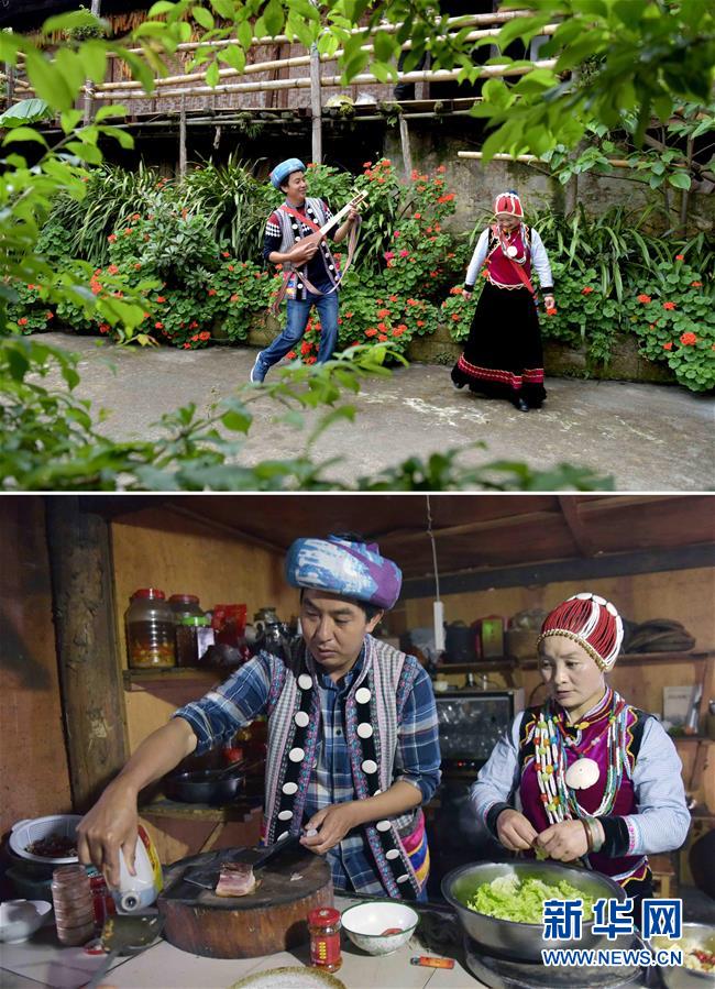 拼版照片上图:郁伍林和鲁冰花在客栈院子里弹唱歌舞(2017年5月27日摄);下图:郁伍林和鲁冰花为客人准备晚餐(2017年5月26日摄)。 云南省怒江傈僳族自治州福贡县匹河怒族乡老姆登村的郁伍林和妻子鲁冰花,是该村开办农家乐和客栈的致富带头人。夫妻俩还创建了茶叶品牌,帮助老姆登村怒族群众把种植的生态茶叶销往国内外。在他们的引导和带动下,山寨的父老乡亲通过经营农家乐客栈和种植茶叶逐步脱贫致富,日子越过越红火。 党的十八大以来,我们坚持以人民为中心的发展思想,明确了到2020年我国现行标准下农村贫困人口实现脱贫、贫困县全部摘帽、解决区域性整体贫困的目标任务。目前看,脱贫进度符合预期,成就举世瞩目。这些成绩的取得,凝聚了全党全国各族人民智慧和心血,是广大干部群众扎扎实实干出来的。 脱贫摘帽不是终点,而是新生活、新奋斗的起点。 新华社记者 杨宗友 摄