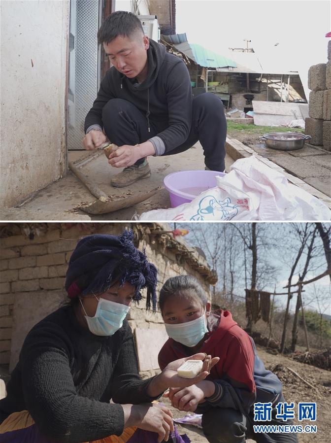 拼版照片上图:在四川省凉山彝族自治州美姑县瓦古乡,彭杨在削土豆皮,准备制作土豆手工皂(3月10日,新华社记者吴光于摄);下图:在瓦古乡,15岁的沙马也曲(右)和她的妈妈拿到了彭杨制作的土豆手工皂(3月10日,新华社记者薛晨摄)。 四川省凉山彝族自治州美姑县瓦古乡扶贫干部彭杨所在的古觉村距乡政府20公里,是美姑县80个尚未脱贫村之一。他深知养成好的生活习惯,对当地脱贫至关重要,所以他不仅督促老百姓叠被子、整理房间,帮当地的孩子们洗头、洗澡,还在疫情期间自制土豆手工皂分发给村民。 彭杨说,疫情后准备发动留守妇女生产手工皂,计划在1年内建成一个吸纳瓦古乡4个村村民的手工皂合作社。 党的十八大以来,我们坚持以人民为中心的发展思想,明确了到2020年我国现行标准下农村贫困人口实现脱贫、贫困县全部摘帽、解决区域性整体贫困的目标任务。目前看,脱贫进度符合预期,成就举世瞩目。这些成绩的取得,凝聚了全党全国各族人民智慧和心血,是广大干部群众扎扎实实干出来的。 脱贫摘帽不是终点,而是新生活、新奋斗的起点。 新华社发