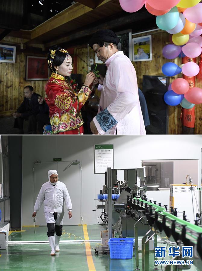 拼版照片上图:婚礼开始前,吴春霞(左)为施六金佩戴胸花(2018年9月24日摄);下图:施六金在十八洞村新建的山泉水厂里工作(2018年2月3日摄)。 地处武陵山腹地的湖南湘西土家族苗族自治州花垣县十八洞村曾深陷贫困。2013年,村里225户中有136户是贫困户,40岁以上的“光棍儿”有30多人。2014年以来,十八洞村逐渐蜕变。2016年初,结束外出打工的施六金返乡办起“苗家乐”。2017年,村里的十八洞村山泉水厂正式建成投产,他受聘成为厂里的技术工人,每月都有固定工资。随着日子越过越好,许多像施六金这样摘了穷帽的大龄“光棍儿”收获了爱情,实现了安居乐业,事业爱情双丰收。 党的十八大以来,我们坚持以人民为中心的发展思想,明确了到2020年我国现行标准下农村贫困人口实现脱贫、贫困县全部摘帽、解决区域性整体贫困的目标任务。目前看,脱贫进度符合预期,成就举世瞩目。这些成绩的取得,凝聚了全党全国各族人民智慧和心血,是广大干部群众扎扎实实干出来的。 脱贫摘帽不是终点,而是新生活、新奋斗的起点。 新华社记者 李尕 摄