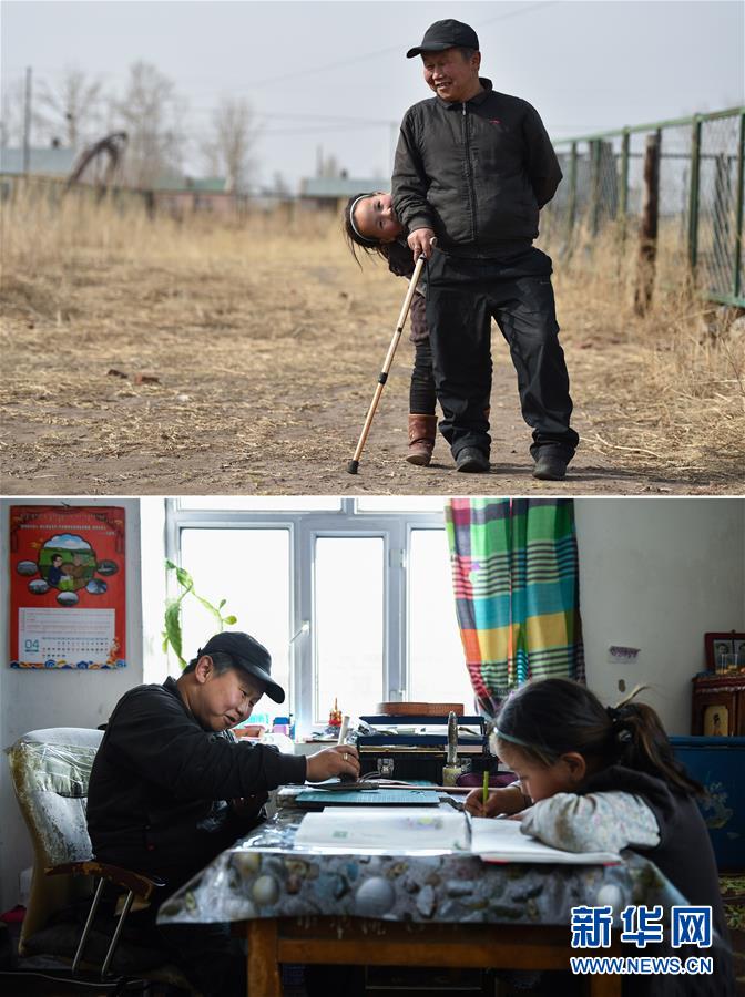 拼版照片上图:在锡尼河镇的出租房外,米格木尔(前)和女儿南吉乐玛一起玩耍;下图:在锡尼河镇的出租房内,米格木尔在进行皮雕,女儿南吉乐玛在温习功课(照片均摄于4月15日)。 2016年,家住内蒙古鄂温克族自治旗锡尼河镇孟根础鲁嘎查的米格木尔因为缺失劳动能力成了建档立卡贫困户。独自抚养女儿的他为了女儿上学离开了牧区来到镇上租房陪读,生活的压力让米格木尔犯了难。2018年春天,他通过当地民族文化产业创业园举办的皮雕手艺培训,让他居家赚钱、陪读两不误,逐步实现稳定脱贫。 2020年4月,我国第一个成立的少数民族自治区——内蒙古自治区宣告全面脱贫“摘帽”。 党的十八大以来,我们坚持以人民为中心的发展思想,明确了到2020年我国现行标准下农村贫困人口实现脱贫、贫困县全部摘帽、解决区域性整体贫困的目标任务。目前看,脱贫进度符合预期,成就举世瞩目。这些成绩的取得,凝聚了全党全国各族人民智慧和心血,是广大干部群众扎扎实实干出来的。 脱贫摘帽不是终点,而是新生活、新奋斗的起点。 新华社记者 刘磊 摄