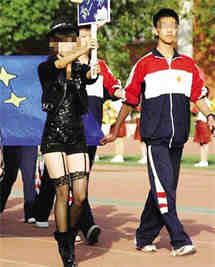 石家庄一重点中学运动会惊现“吊袜举牌女”。在某中学体育节开幕式上,一名打扮时尚的女生手举“高二11班”的牌子走在班级队列的最前面,下身却穿着与学生身份极不相称的黑色吊袜,网友冠之以“黑丝女”。批评者认为:这种被称为“情趣”吊袜的服装让人很容易浮想联翩,对于生理和心理尚未发育成熟的高中生来讲极具诱导作用。如此穿着与学生身份极不相称。记者注意到,批评声音中,网友多半指向学校美育、德育教育的失败。(3月23日《扬子晚报》)