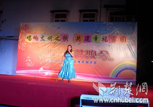 荆楚网消息(通讯员 彭茜媛)积玉桥街金地花园社区2014年7月21日举办了“唱响文明之歌 共建幸福家园”纳凉文艺晚会,广大社区居民踊跃参加,仲夏闷热的天气并没有阻挡居民们观看晚会的脚步,也没有影响居民们演出的热情。今晚的节目多姿多彩,今晚的人们情绪高涨。激情的音乐、热辣的特编现代舞引得居民们阵阵叫好。其中有一位女孩最引人注目,她就是二级肢残、毕业于中南财经政法大学的方俊,她声情并茂地演唱了《 美丽的草原我的家》、《小小新娘花》等歌曲,并赢得阵阵掌声。