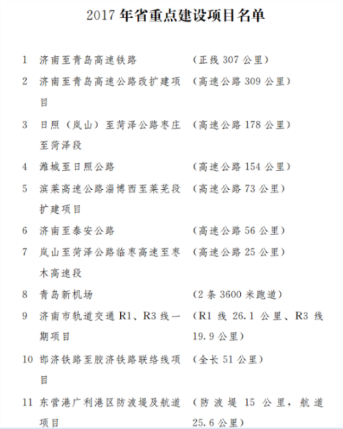 齐鲁网3月28日讯 近日,山东省人民政府关于下达2017年省重点项目名单的通知,2017年省重点建设项目名单中包含济南至青岛高速铁路、济南至青岛高速公路改扩建项目等,共120个项目在列。