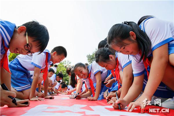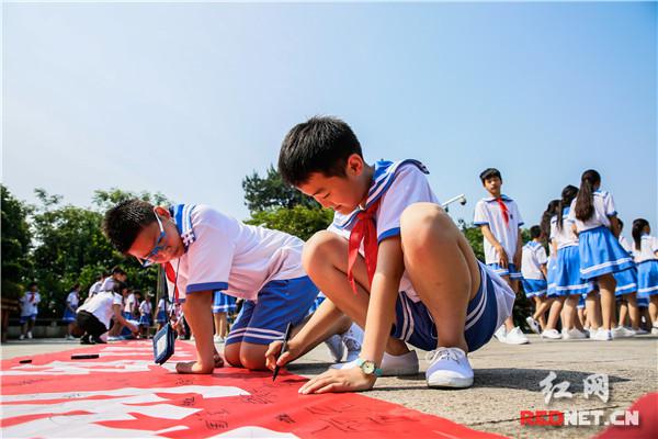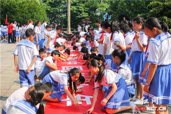 红网郴州5月31日讯(记者 张泉森 卢黎清 朱丽萍 唐哲宁 何红华)“树立正确的网络观,争做文明学生、文明网民……从我做起,争做新时代的好少年,并让网络伴随我们健康成长……”在六一国际儿童节到来之际,红网携手湖南省郴州市第四完全小学的同学们向全国中小学生发起了《文明上网倡议书》,并组织1500名小学生在“努力弘扬网络文明,争做中国好少年”的横幅上庄重地签下自己的名字。