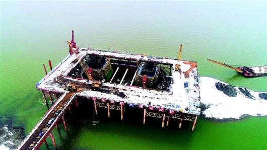 1月1日,建设者在赤壁长江大桥上忙碌着。连日来,中铁大桥局五公司项目部广大建设者放弃元旦节日休息,不分昼夜,不畏严寒,加紧 施 工 ,于2018年 12月31日完成南岸滩桥首个水中墩承台施工。目前南岸滩桥11个水中墩承台,已经开工9个,各作业点全面开花。(视界网马永斌 摄)