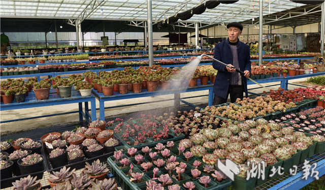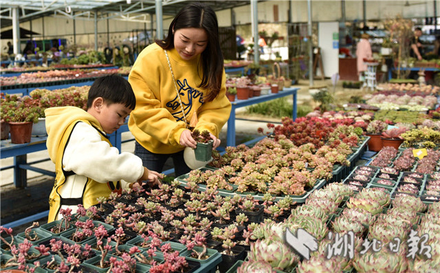3月10日,在湖北省通城县马港镇界上村东山大屋多肉植物种植大棚社员忙着移栽、管理、销售多肉植物。连日来,湖北省通城县马港镇界上村东山大屋多肉植物种植花卉大棚里春意盎然,五颜六色的多肉小盆栽连绵成花海,颜色丰富多彩,吸引游客拍照、购买,开展亲子活动。