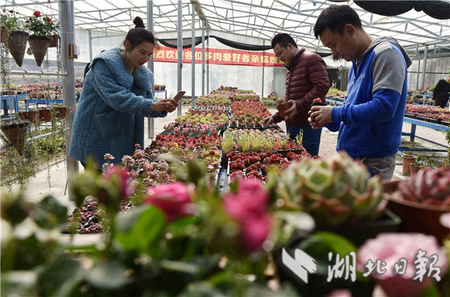 3月10日,在湖北省通城县马港镇界上村东山大屋多肉植物种植大棚社员忙着移栽、管理、销售多肉植物。