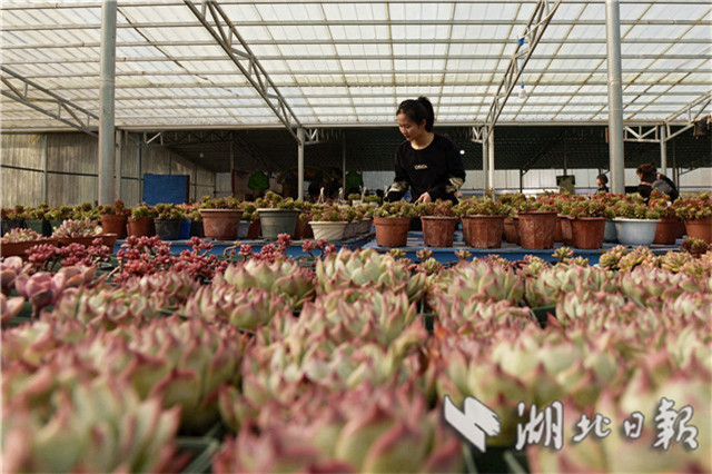 据了解,该大棚是当地黎敏、杜静、黎姣等5名创业女青年返乡创办的。2016年初,她们共同投资100万元返乡创办青叶多肉植物种植专业合作社,种植面积30亩,近千个品种,借助“互联网+”平台,把多肉植物产品放到网上销售,年产销多肉植物30多万株。社里还带动附近10多个村近百名建档立卡贫困农户发展花卉种植,成为当地农民脱贫致富新路径,助力乡村振兴。(视界网刘建平摄)