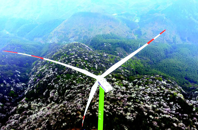3月30日,鸟瞰咸宁大幕山,一台台发电风机如鸟儿展翅,“徜徉”在漫山樱花花海中。大幕山风力发电场由中广核集团投资5.5亿元建设,计划安装29台风力发电机组,总装机规模63.8兆瓦,年发电量约1.1亿千瓦时。目前已安装风机16台,预计5月底完工、并网发电。