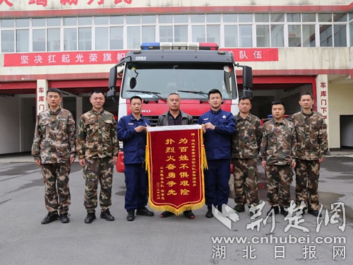荆楚网客户端-荆楚网消息(通讯员 朱燕林 徐聪)近日,山东陵县车队的车队代表宋金忠先生不远千里来到湖北省咸宁赤壁市消防大队,将一面印有“为百姓不惧艰险,扑烈火奋勇争先”的锦旗亲手送到消防指战员的手上,专程感谢消防指战员于3月3日在京港澳高速湖北赤壁收费站高速出口处奋力扑灭他货车起火的感激之情,并向辛勤奋战在防、灭火第一线的全体消防指战员表示崇高的敬意。