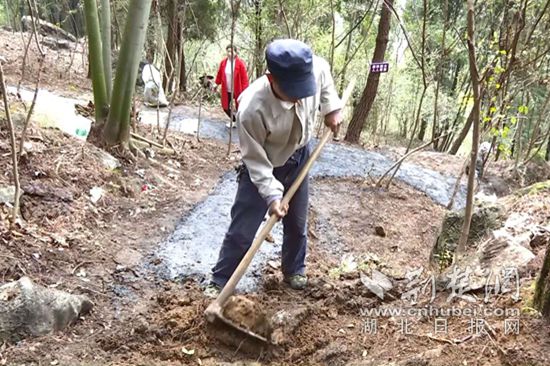 在山上的一片陡坡上,记者看到,二十多名村民正在热火朝天地铺路,山上不时还有来来往往爬山的村民,原来,今天是该村周家湾达观山生态休闲公园试开放的第一天。