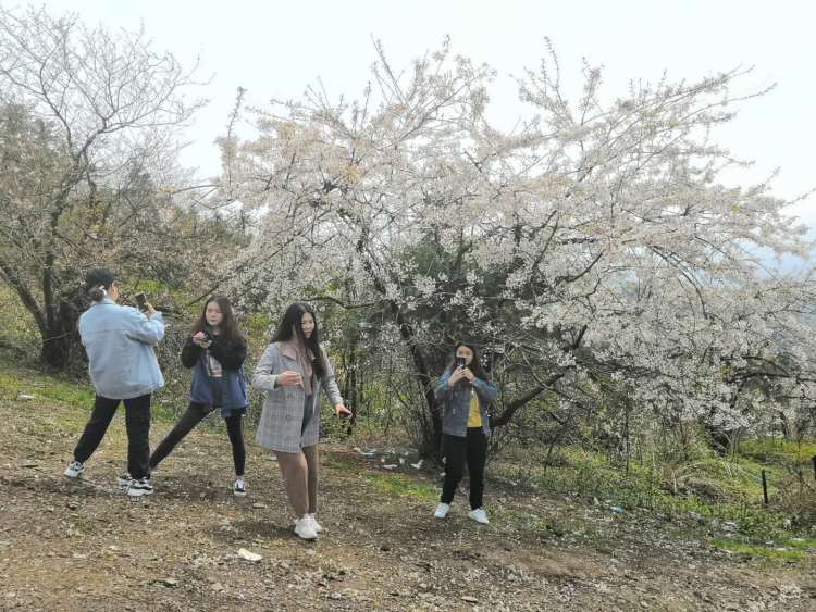 来自湖北大学艺术学院、中南民族大学美术学院、湖北美术学院等高校的师生一行登上大幕山山顶,欣赏遍地野樱花,俯瞰绵绵山谷,大家对这里的风景赞不绝口,纷纷拍照留念。