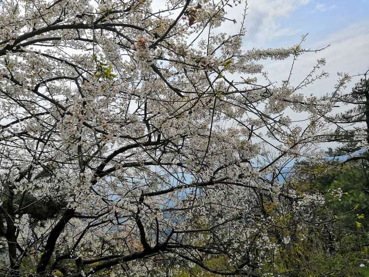 登上山顶,漫山遍野的樱花开放在树丛中,大幕的樱花长得特别的素雅,游客看了心中便升起一股怜爱之情。