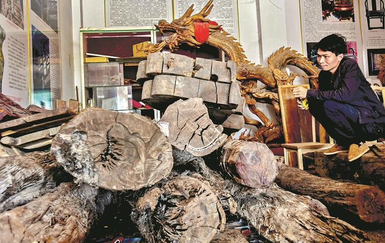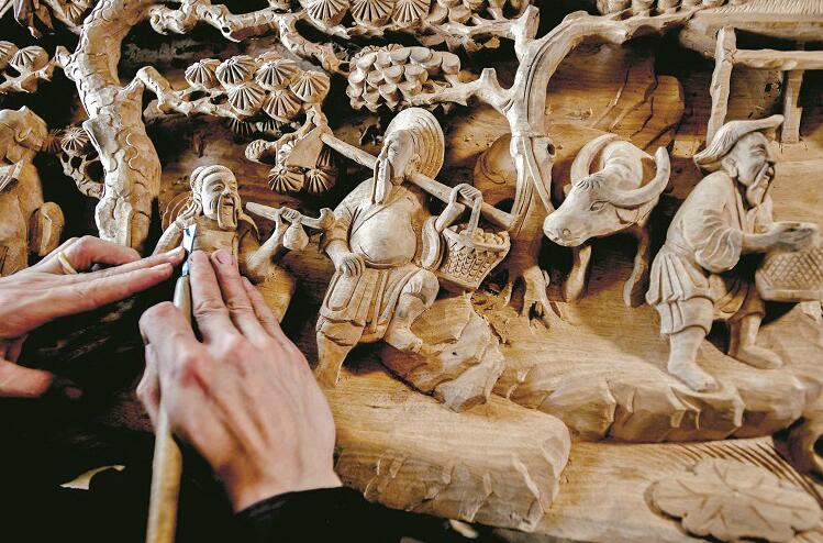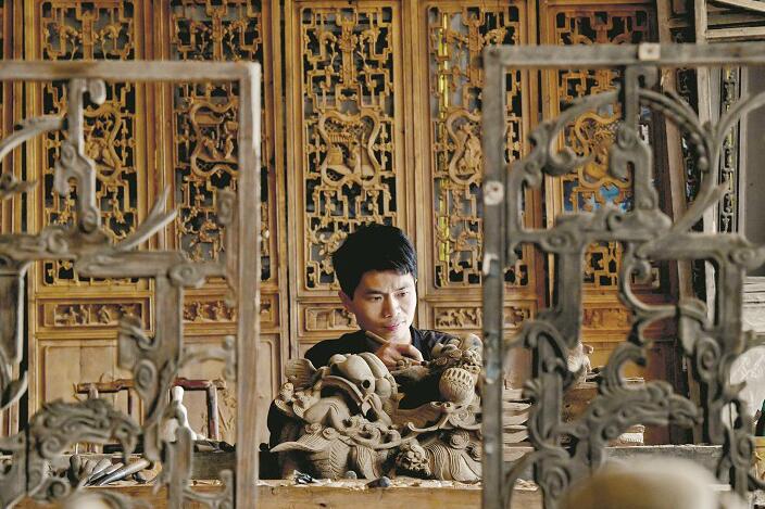 图为:成希在雕刻房梁,一个个人物在他的刀下栩栩如生