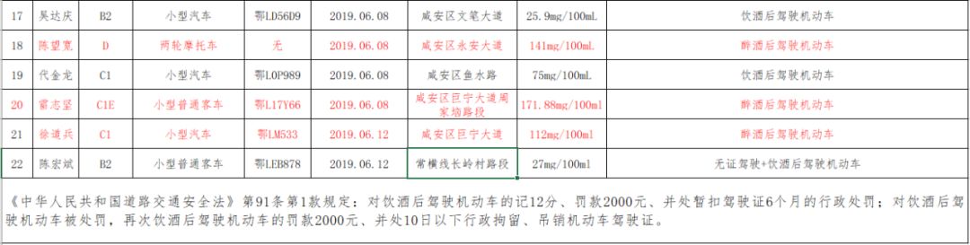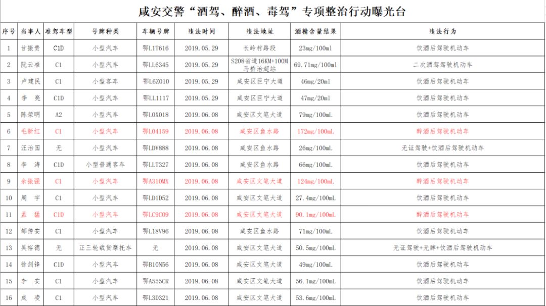 咸安公安分局交警大队对酒驾醉驾持续保持高压严管“零容忍”态势,同时对近半个月(5月29日——6月13日)以来的酒驾醉驾驾驶人进行实名曝光。